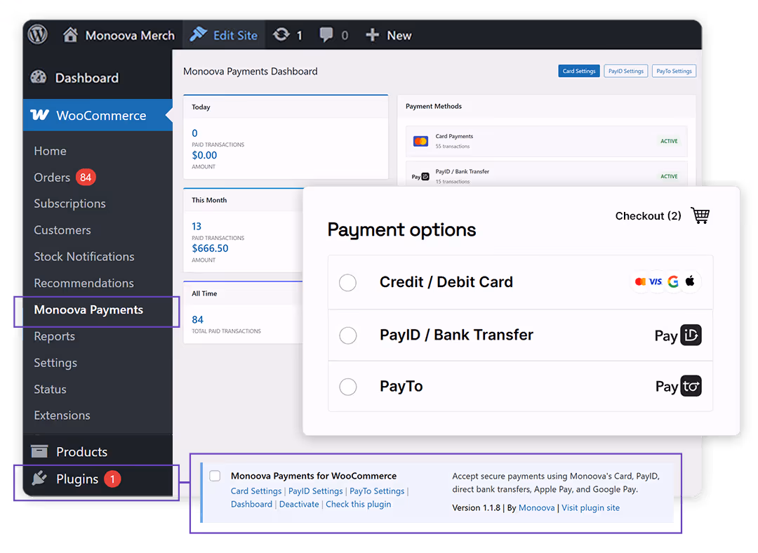 Link your WooCommerce store to Monoova in a few easy steps and select from a wide range of payment methods for your checkout. You can track transaction history and manage refunds via an easy-to-use dashboard in your WordPress Admin view.