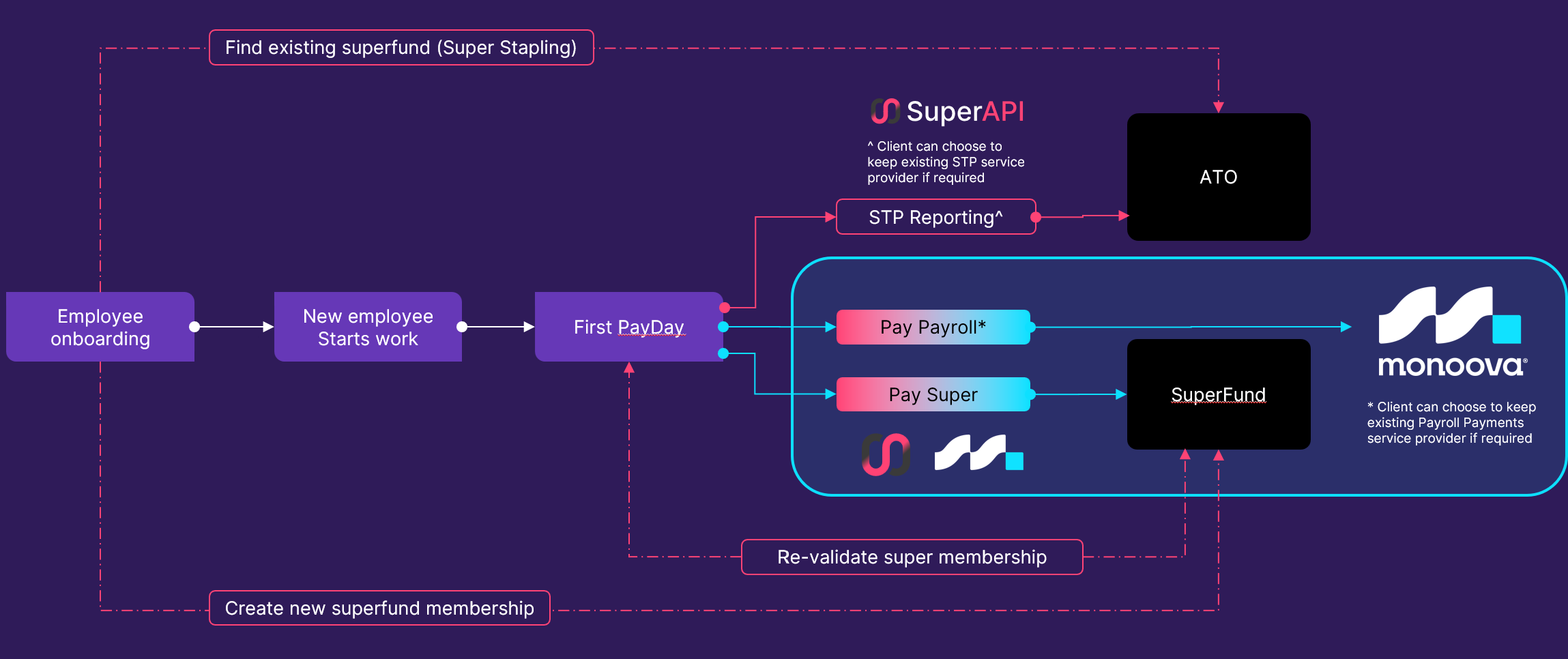 To help make the change easier, Monoova and SuperAPI have partnered to deliver Australia’s first fully orchestrated, end-to-end payday super solution.